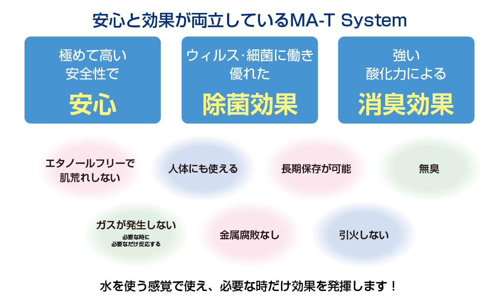 MA-T工業会はコチラから MA-Tの特性 MA-T(Matching Transformation system)とは、酸化制御技術のため、活性化の強弱を制御することで広範な 応用展開が可能な仕組み(システム)です。 大阪大学にてMA-Tの水性ラジカル生成機構が解明され、制御された水性ラジカルが必要な時に必要な量だけ生成する仕組みです。(下部イメージ図) ●噴射対象に菌やウィルスがいた場合 ●水性ラジカルが菌やウィルスにぶつかることで除菌し、消費。 ●水性ラジカルが消費されると新たに水性ラジカルが一つ生成され、菌やウィルスなどが無くなるまで水性ラジカルが順次生成。 1.高い安全性 高い除菌力と高い安全性を両立した新しい除菌システム。 従来の常識では、安全性と除菌力はトレードオフの関係でしたが、安全性を重視して開発されたMA-Tは従来の除菌剤の課題を解決しました。 2.確かな効能 たばこ臭や接着剤、ネイルリムーバーのような化学的で特異な刺激臭にも効果を発揮します。 3.長期保存が可能 製造から3年の保存が可能です。 MA-Tと他の除菌剤の特徴比較